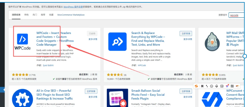 安装插件:在 WP 后台“插件”->“安装插件”搜索 WPCode 并安装激活。