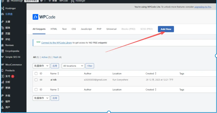 新建代码片段:进入 WPCode 菜单,选择 “Add Snippet”。