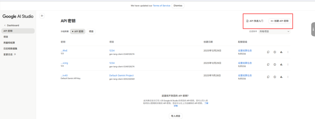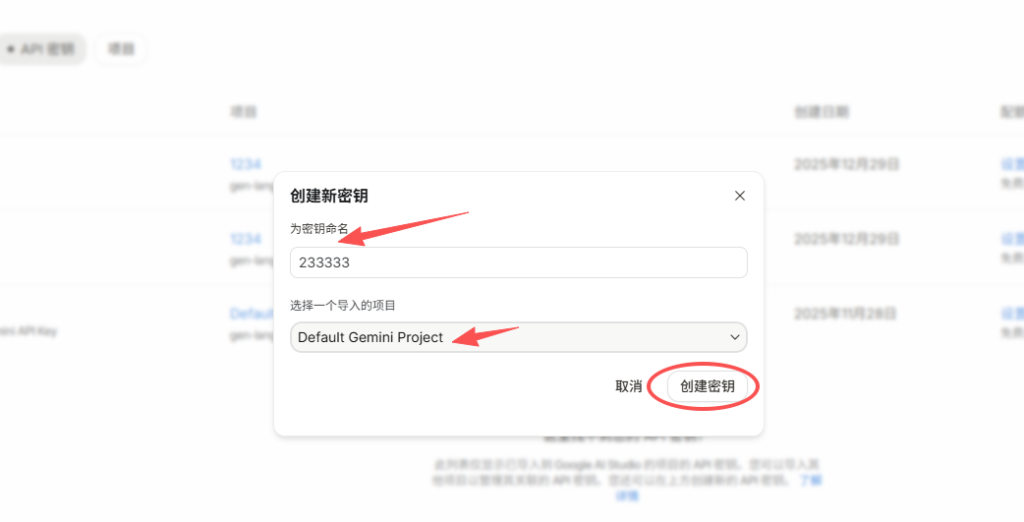 创建 Key:点击 “Create API key”,系统会生成一串类似 AIzaSy… 的代码。